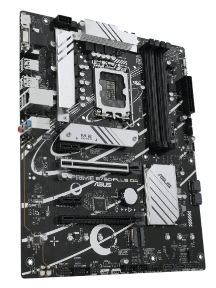 ASUS Prime B760-PLUS D4, an Intel® B760 LGA 1700 ATX motherboard with PCIe 5.0, three PCIe 4.0 M.2 slots, DDR4, Realtek 2.5Gb Ethernet, DisplayPort, VGA, HDMI®, SATA 6 Gbps, USB 3.2 Gen 2x2 Type-C®, front USB 3.2 Gen 1 Type-C®, Thunderbolt™ (USB4®) support, Aura Sync